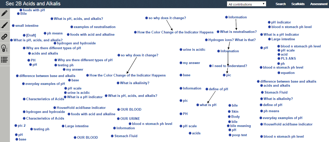 The third lesson, Hisham brought in another trigger experiment on soil acidity, where students experimented with the acidity/alkalinity of three different types of soil. This was again followed by class discussions, and students subsequently went online to KF to post their notes and ideas. In a KF view 'Sources of Food' (Fig. 1 below), students brought up ideas on agriculture and mass production.